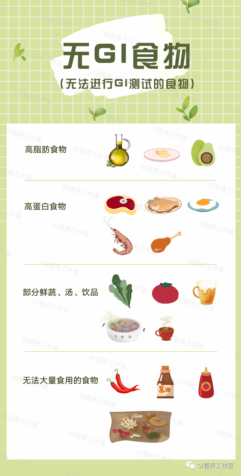 GI体现的是食物中可利用碳水化合物的性质,因此,没有可利用碳水化合物的食物(或可利用碳水化合物含量极低),就没有GI值,这类食物包括: